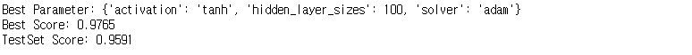 탐색결과 activation은 'tanh', hidden_layer_sizes는 100, solver는 'adam' 조합으로 나왔다.