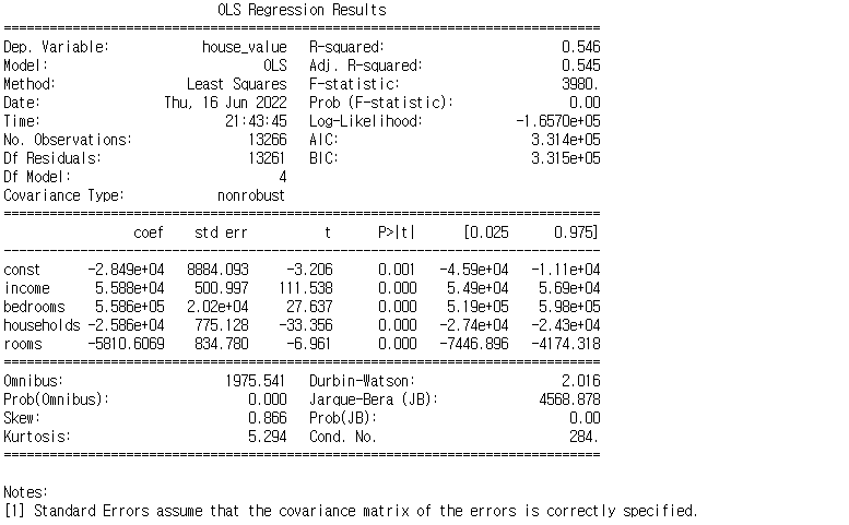 예를들어 income이 1증가할 때 house_value는 약 5.6만 달러 증가한다는 의미이다.