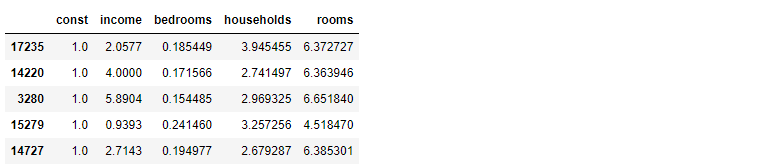 주택가격 데이터를 train_test_split한 X_train을 상수항 변수를 더하여(sm.add_constant) x_train_new라는 변수로 만들고 X_test도 동일하게 X_test_new라고 한다. 'const'라는 변수가 모두 '1'로 되어 있는데 이 변수가 상수를 추정하는 역할을 한다.