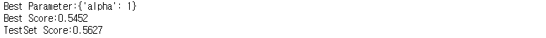 분석결과 최적의 하이퍼파라미터는 alpha가 0.5일때이며 정확도는 각각 54.5, 56.2%로 나왔다.