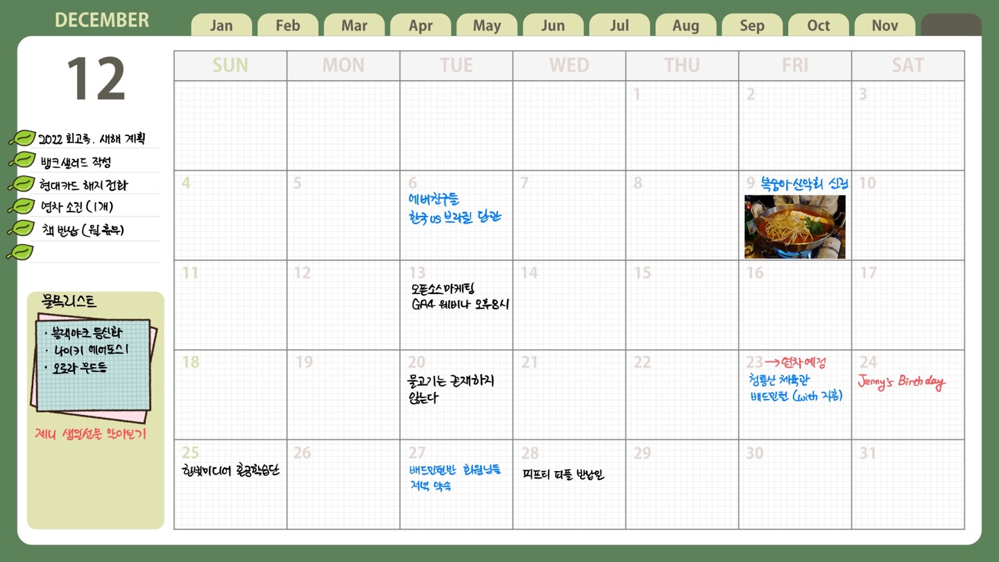 좌측엔 이번 달 꼭 해야하는 중요 일정들을 메모 해놓고