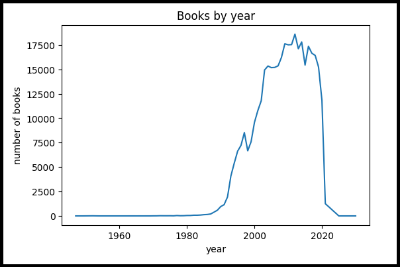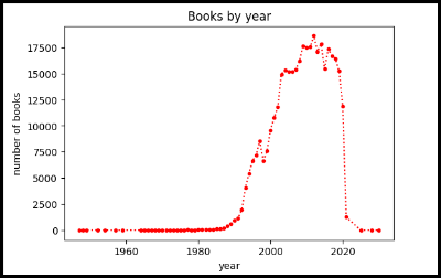 연도별 발행 도서 개수를 그래프에 표시하면 그래프가 너무 난잡해지기 때문에 슬라이스 연산자(:)를 사용해 다섯 개씩 건너 뛰며 count_by_year 값을 선택했다. items() 메서드를 사용해서 인덱스와 값을 감싼 튜플을 얻었다.