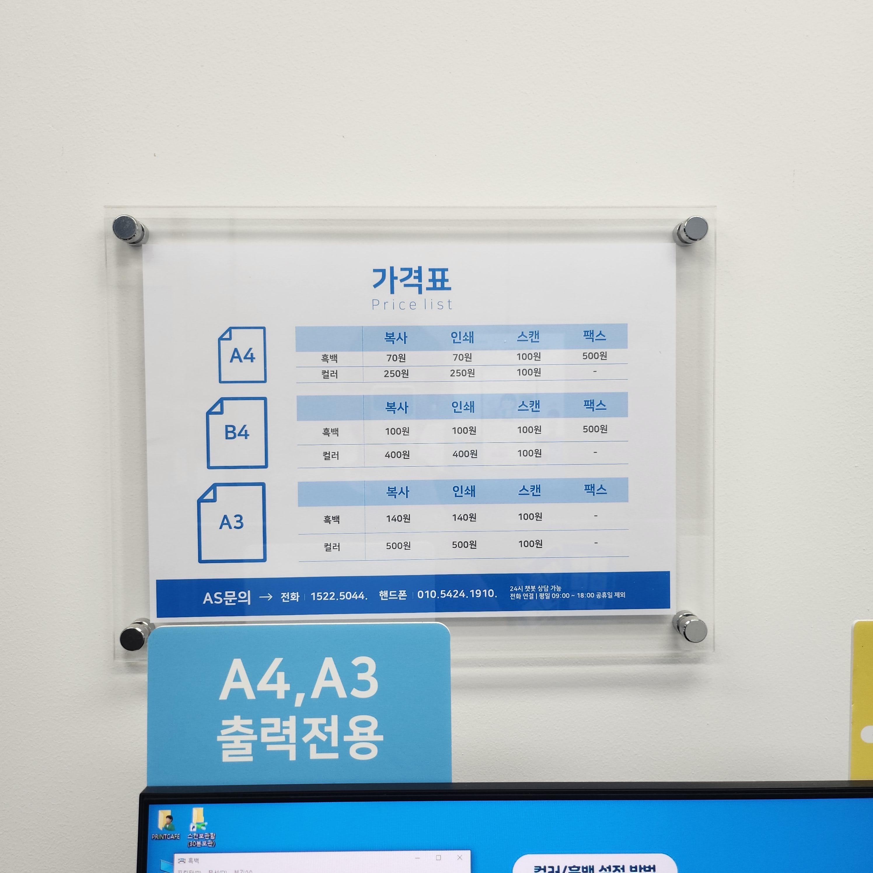 프린트카페의 복사, 인쇄, 스캔, 팩스의 장당 가격 사진입니다.