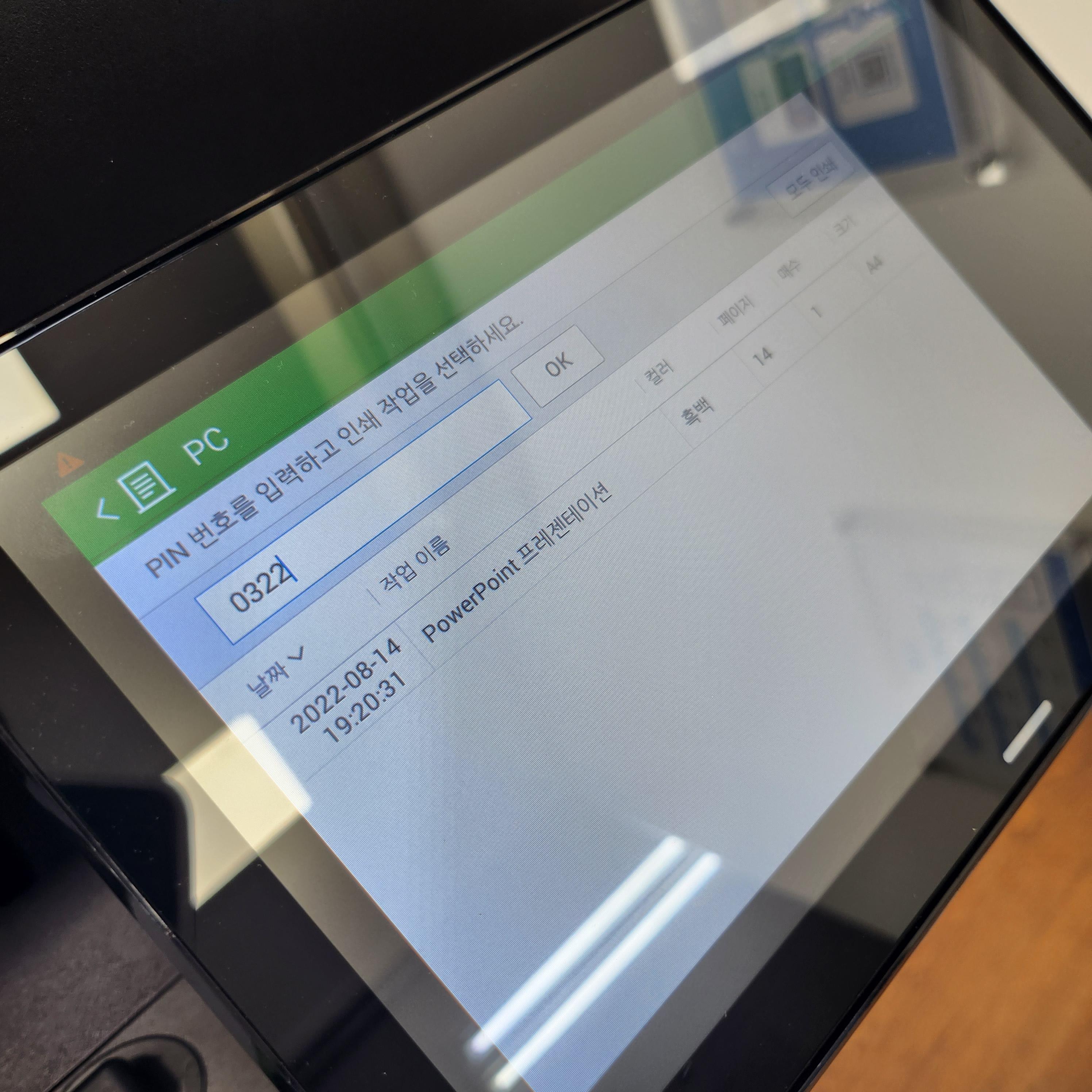 3) 프린터기에서 인쇄할 파일의 위치(PC) 터치 후 식별번호 입력