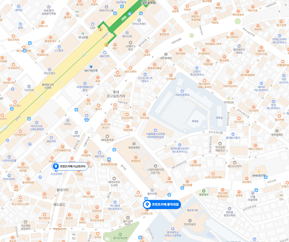 서교프라자점과 홍익대점이 있어요.
